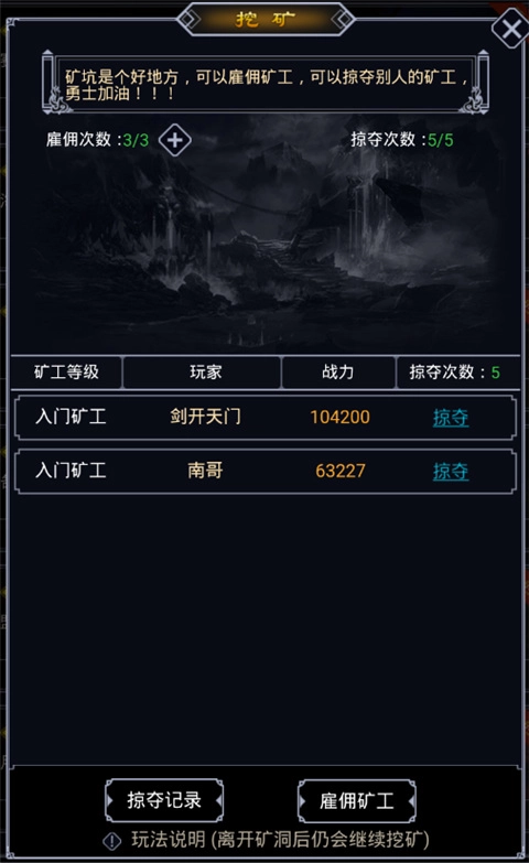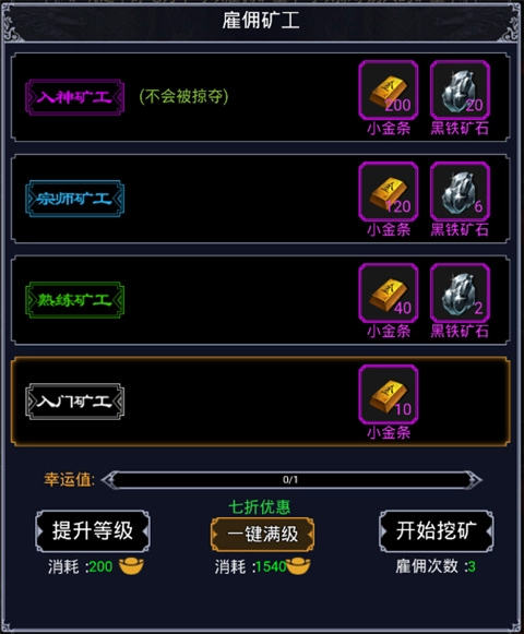 玩家通过雇佣矿工,30分钟后获得固定数量的小金条和黑铁矿石。可以通过消耗元宝提升矿工的等级,增加获得的小金条以及黑铁矿石的数量。消耗200元宝提升一次等级,有几率成功,同时增加一点幸运值。当幸运值满时,提升等级一定成功。还可以花费1540元宝直接提升矿工至满级,并且不会被掠夺。玩家一天挖矿三次,可以通过消耗200元宝增加一次挖矿次数。
