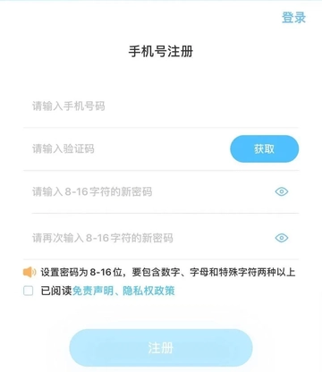 在注册界面,用户需输入手机号、手机获取的“验证码”以及登录密码。密码要求设置为8 - 16位,且需由数字、字符、字母等至少两种元素组合而成。完成上述信息填写后,点击下方的“注册”按钮,即可完成新用户注册。