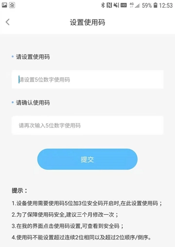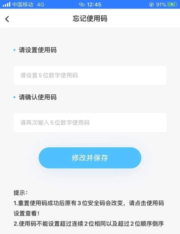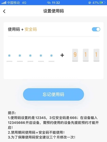 若用户遗忘了原先设置的使用码,可通过修改使用码来实现使用码的二次设置。需留意的是,在重新修改使用码时,系统自动生成的3位安全码也会重新分配。