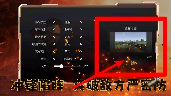 1. 对局设定:可对匹配类型、时间限制、最大得分以及地图破坏进行调整,同时支持关闭友军火力,还能设定人数与难度。挑选好地图后,点击“开始”即可进入战场。