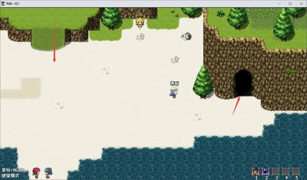 接下来我们前往落霜洞窟,位于该地图的右下角,我们往沙滩上面走来到草地,然后左转过桥,顺着这根藤蔓下来,就是落霜洞窟的入口了。