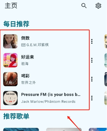 2、也可以利用上方的搜索栏,寻找自己喜爱的歌曲或歌手