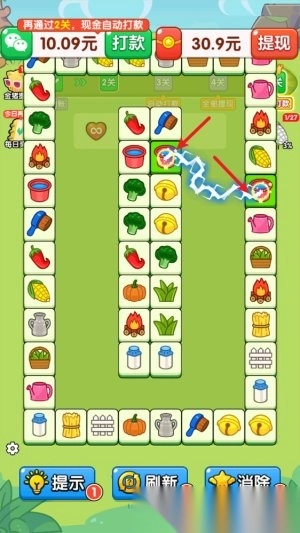 3、下面还有着提示、刷新和消除三种道具,可以帮助你更有效率的闯过关卡。
