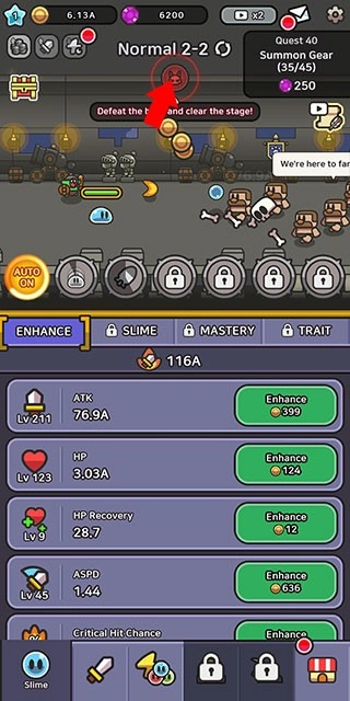 5、失败了也没关系,把手机放着挂机,史莱姆会自己成长,慢慢刷资源、变得更强大!