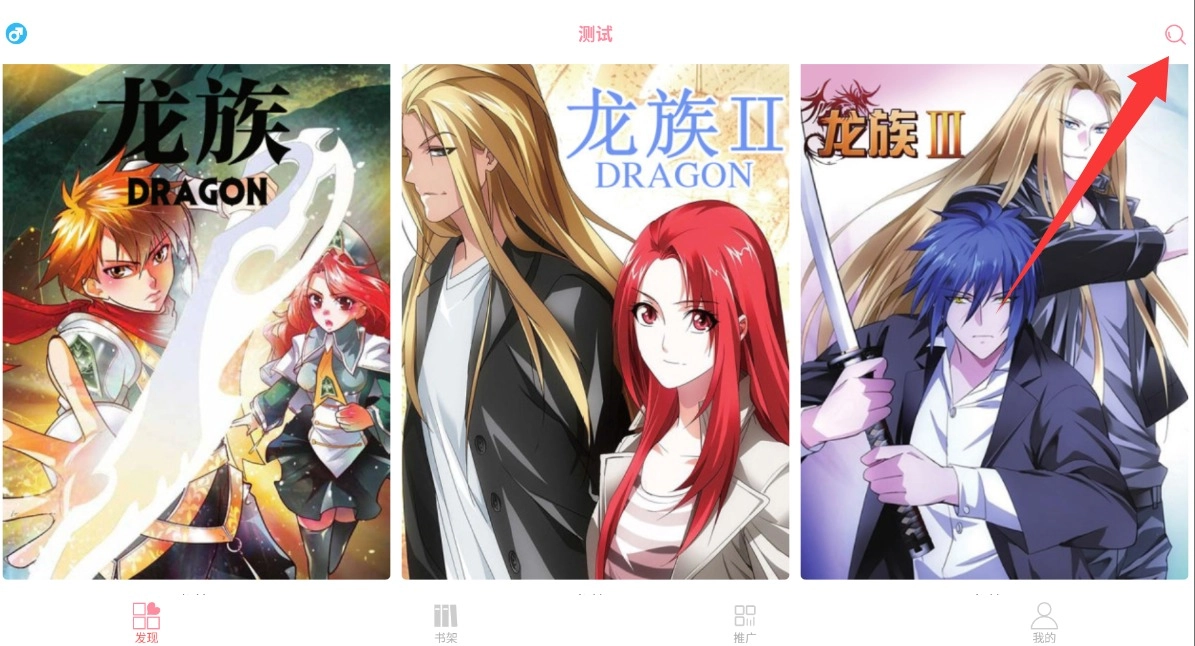 3、成功登录后进入首页,点击右上角搜索图标输入作品名称或关键词即可查找想要观看的漫画。