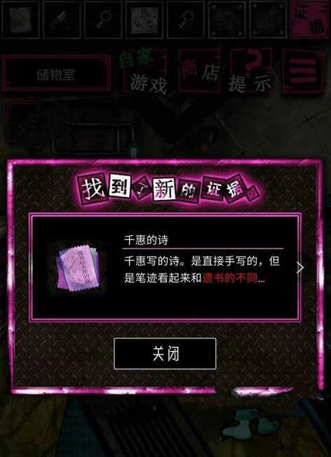 14.去储物室,拿小钥匙开第二个盒子,获得证据“字迹”