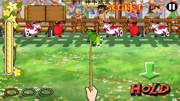 1、进入游戏,看到牛群跑动,屏幕上方显示SCORE分数为0,手持绳索准备套牛。