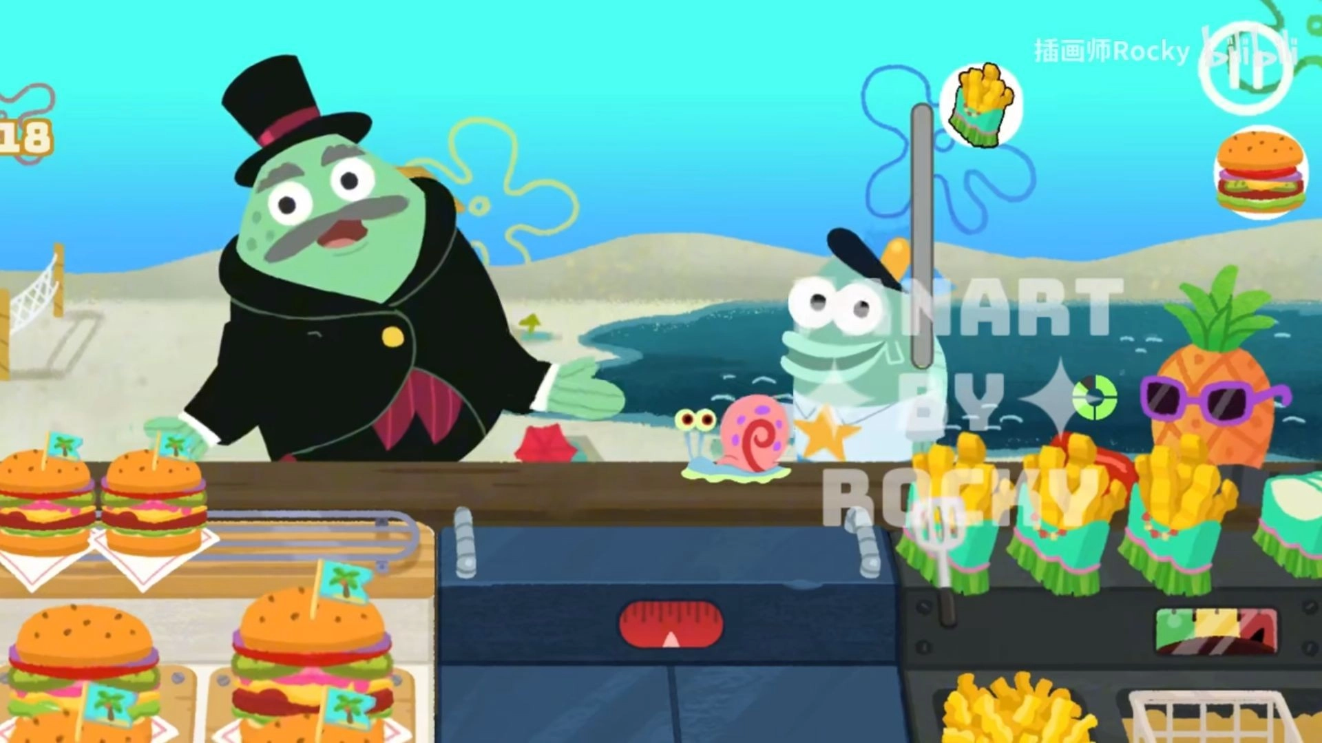 2、【经营店铺】在里面经营属于自己的蟹堡王,每天都有海量的顾客前来购买,了解汉堡包的制作流程,不断增加速度。