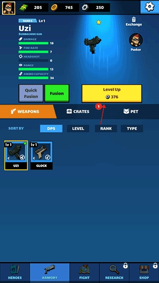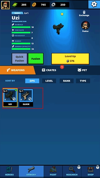 3、进入游戏之后,点击角色进行武器威力升级,也可以使用道具炸弹;