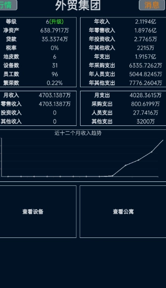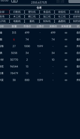 仓库——拥有所有的产品展示,显示数量,可以对产品外销(售卖价格建议定在2X-1,前提建立在城市消费水平最高以下,不然卖不出去),自用(部分产品需要一些材料,如果外销没有存货,所需要这部分材料的产品就会不生产),丢弃(丢掉不需要的物品)