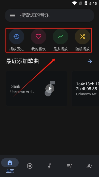 2、点击下方的音符按钮可以查看你的本地音乐资源
