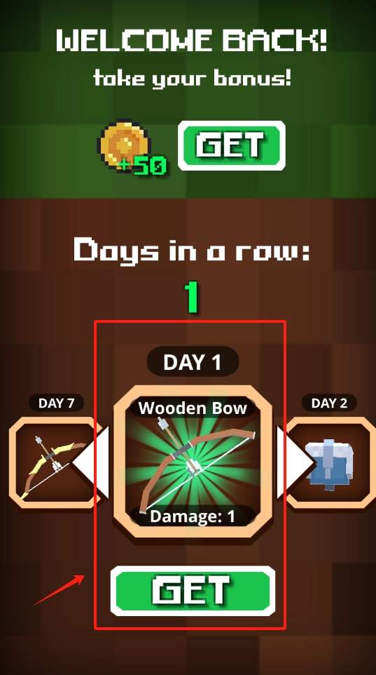 2、领取登录奖励,点击GET获取木弓,查看后续每日奖励。