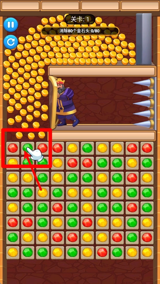 2.点击相同颜色的宝石图案进行消除,集满指定数量金石头后可打通道路释放金币完成当前任务目标。