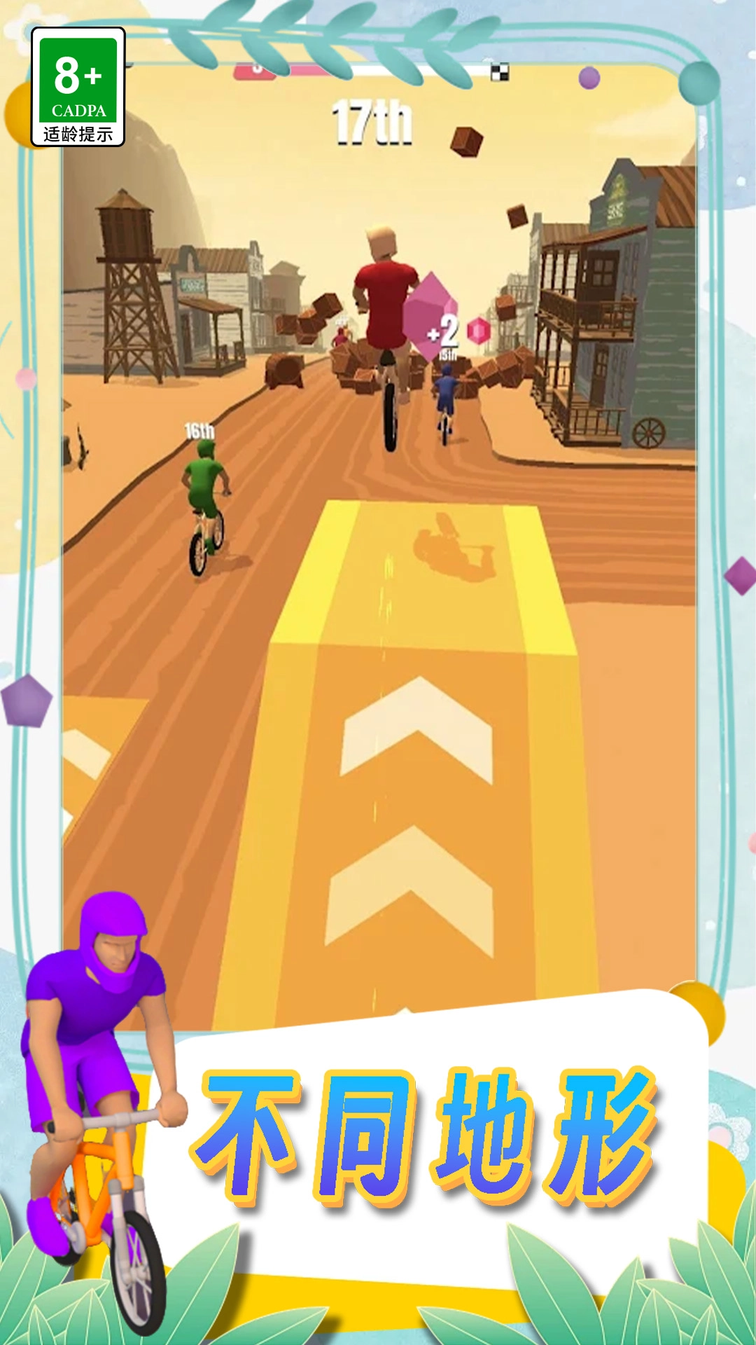 1、通过左右滑动屏幕,控制角色在赛道上灵活移动,巧妙躲避各种障碍物,保证骑行安全。