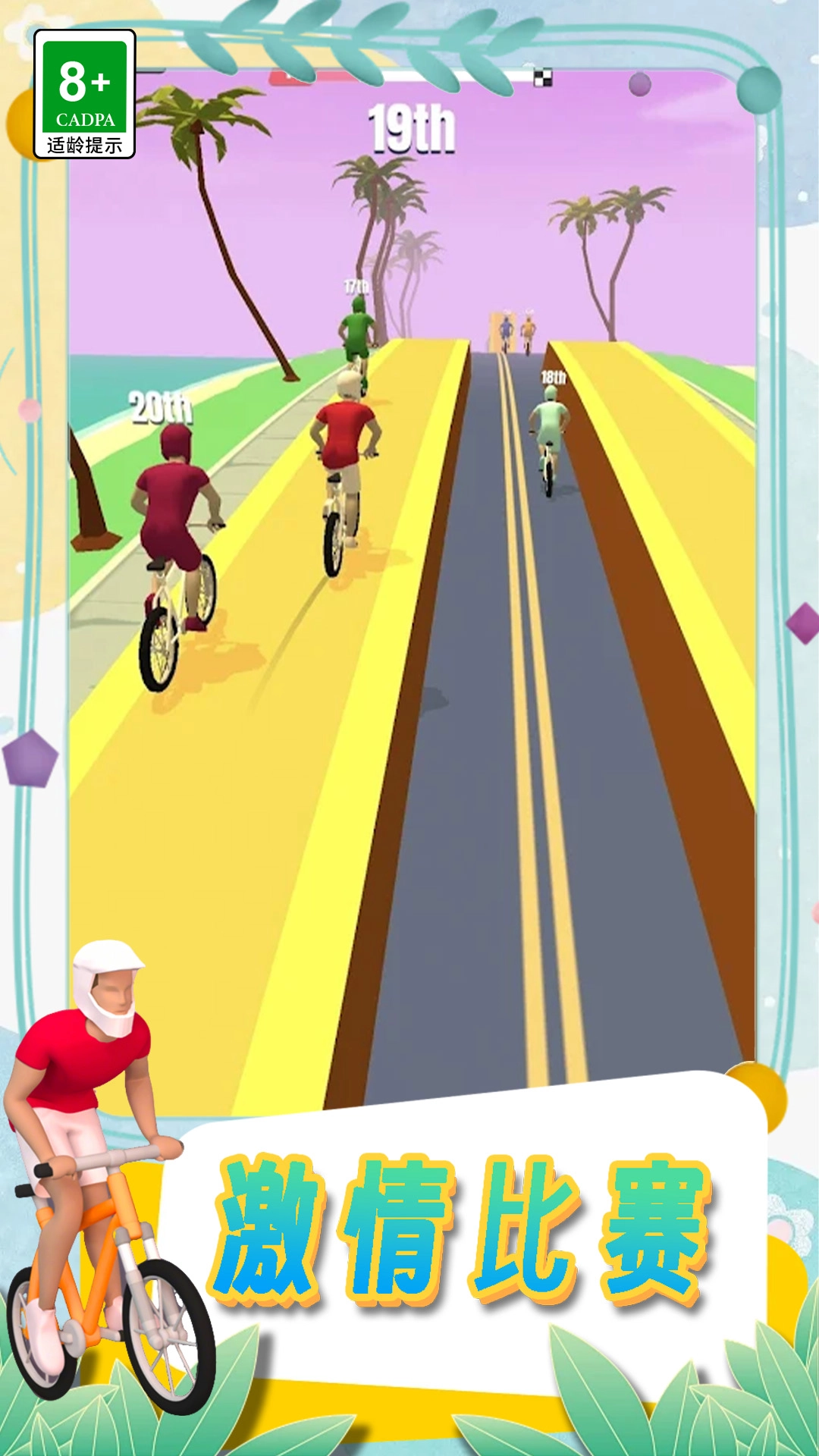 挑战自行车比赛,这是一款既好玩又简单的自行车跑酷游戏。加入关卡比赛,与众多自行车手一同竞技。准备就绪后即可操作,通过左右腾挪、跳跃来前行。前进途中布满了障碍物,一切都充满未知,每一次挑战都不会重复,主要考验你的手速与反应能力。