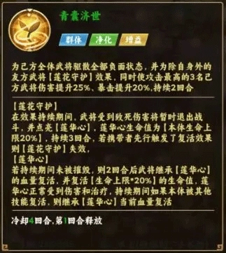 而核心辅助神·华佗一技能【青囊济世】集加攻、净化于一身,还能让阵亡角色变成莲华心。一但莲华心在队友的控制和护盾保护下存活两回合便能使阵亡的队友复活,容错率极高。