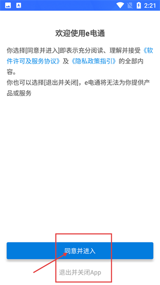 1进入应用后,需阅读《软件许可及服务协议》与《隐私政策指引》,点击【同意并进入】按钮,才能使用【e电通】的相关服务。