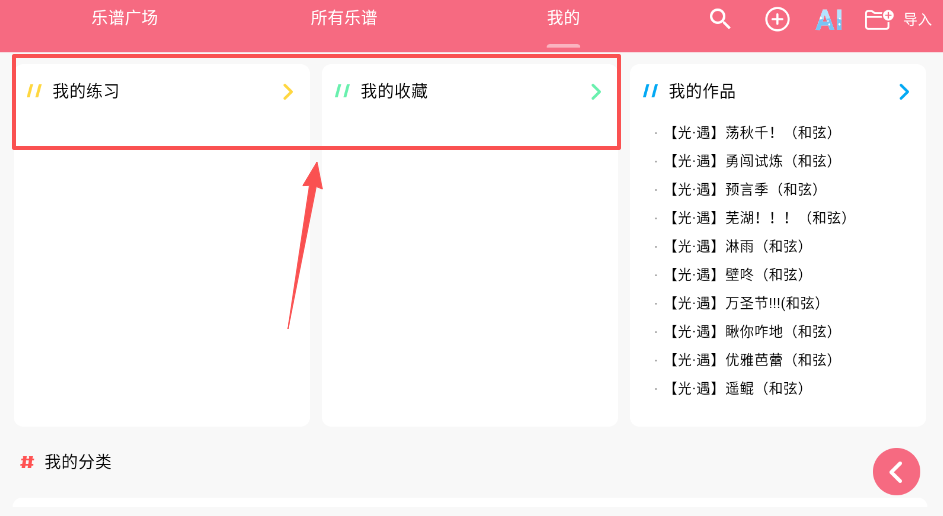 4、请记得在乐谱广场的“我的练习”里管理你的作品和收藏哦。由于乐谱是存储在手机本地的,一旦卸载软件就会丢失,所以一定要及时导出做好备份。