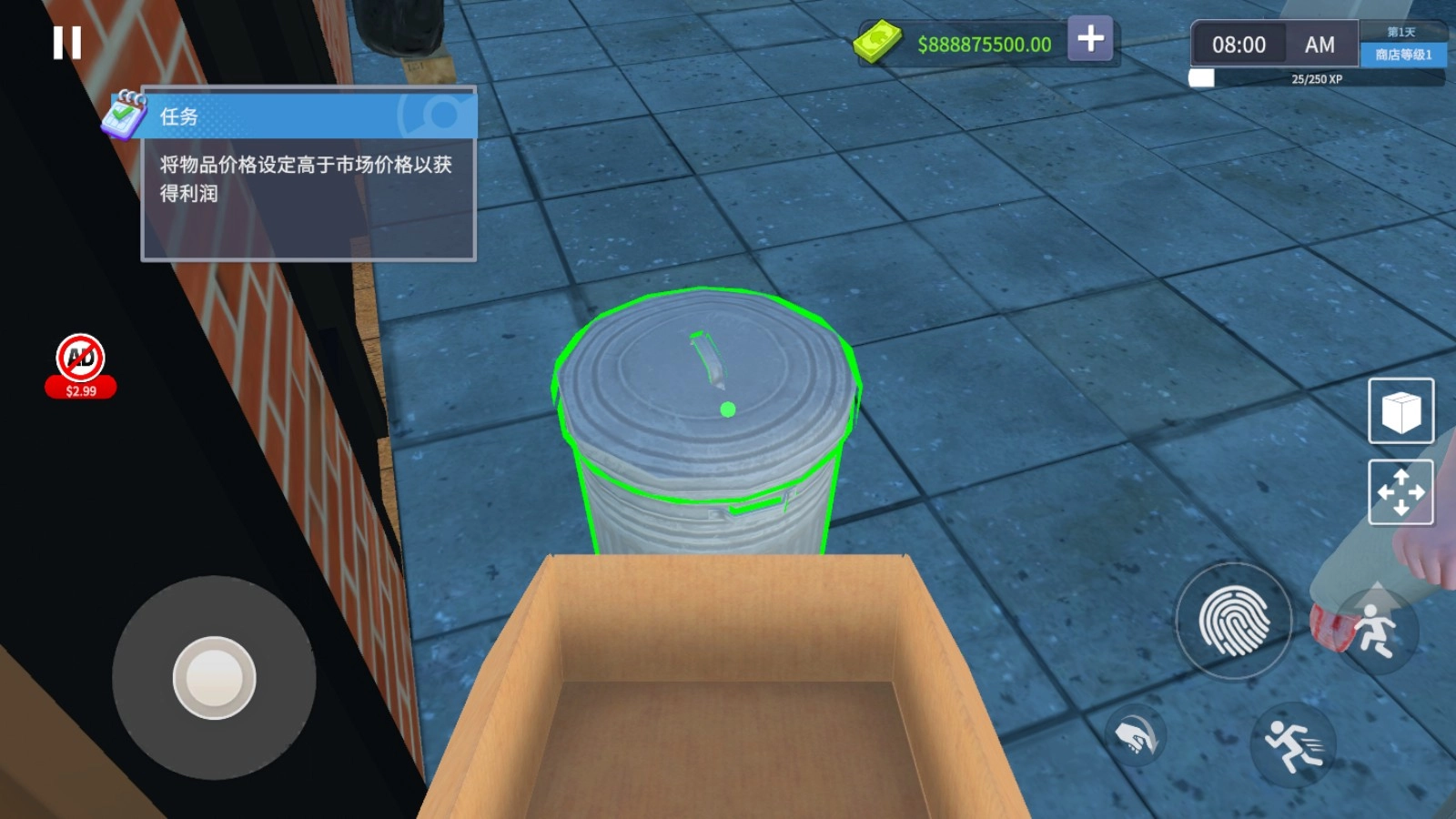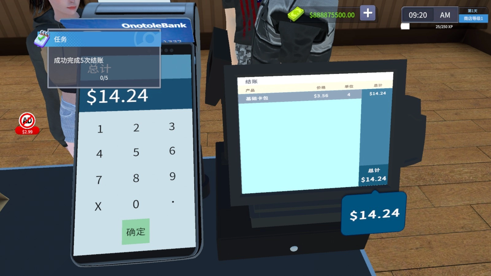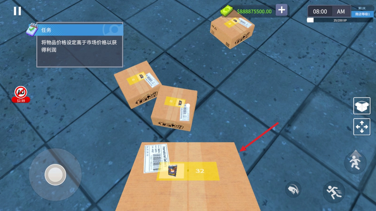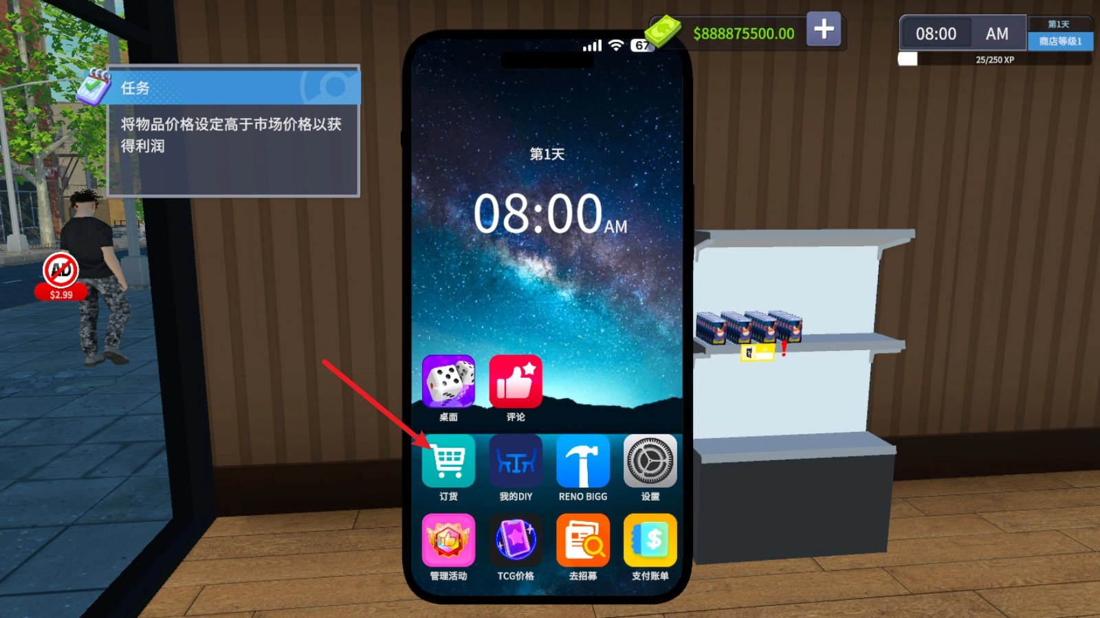 游戏开始后,先点击界面左上角的手机图标,这里是采购区域。选择你想要的卡包,点击加入购物车并完成付款,之后商品会配送到店门口,你可以准备接收新货物了。