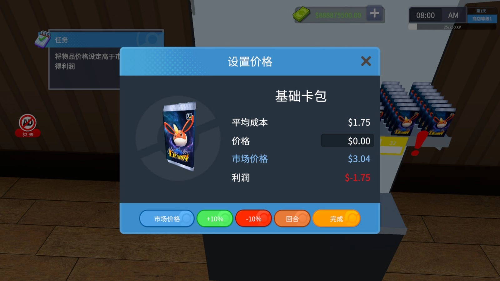 5、当货物摆放到货架上后,点击卡包旁的标价牌即可进行定价。根据市场的变化合理定价,确保你的卡牌能够吸引顾客,同时也能赚取丰厚的利润。