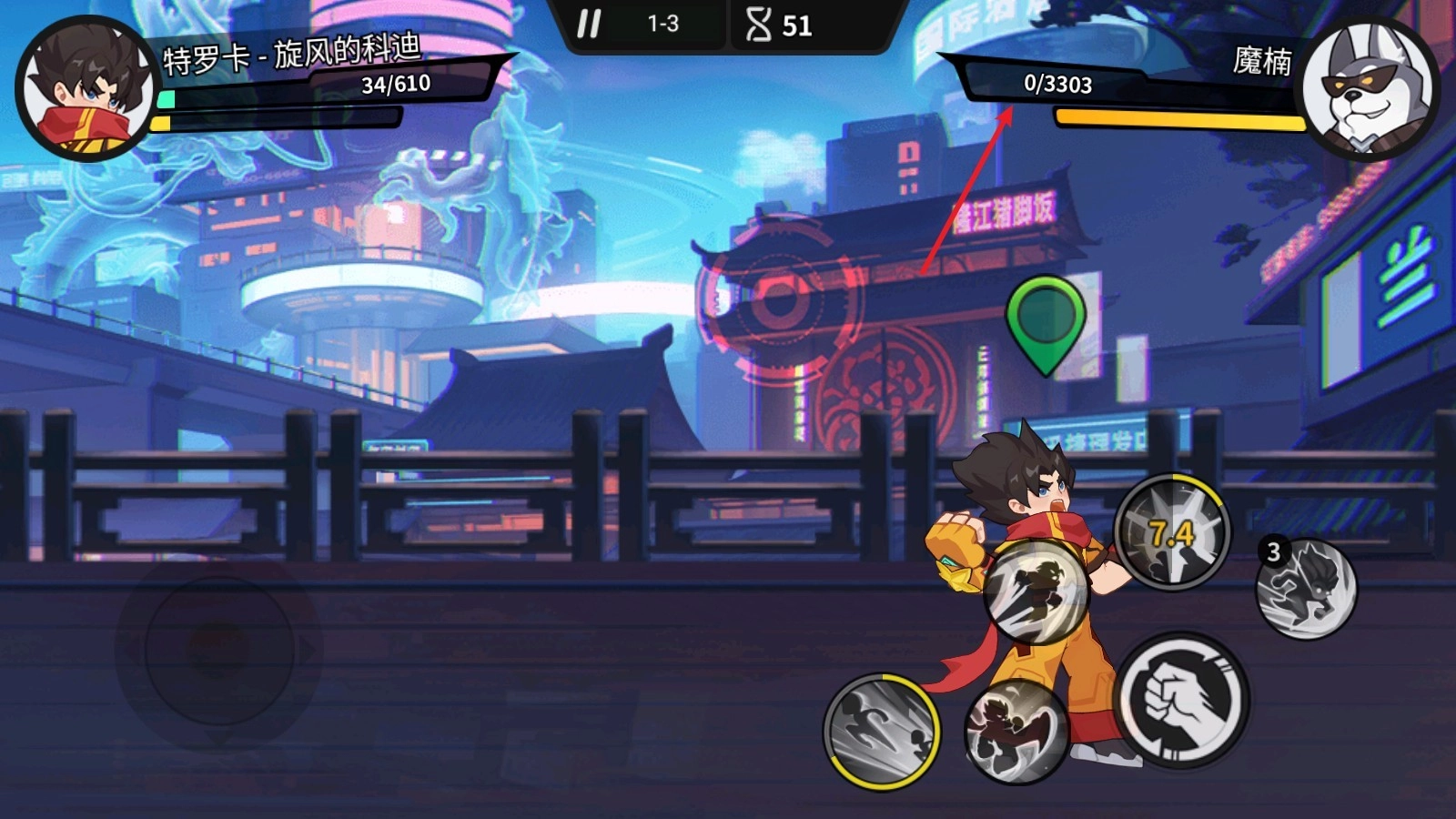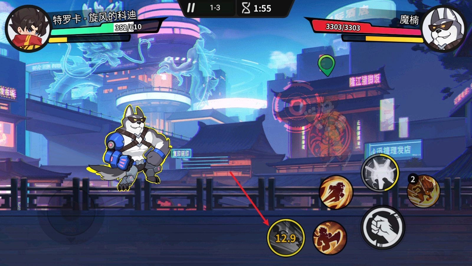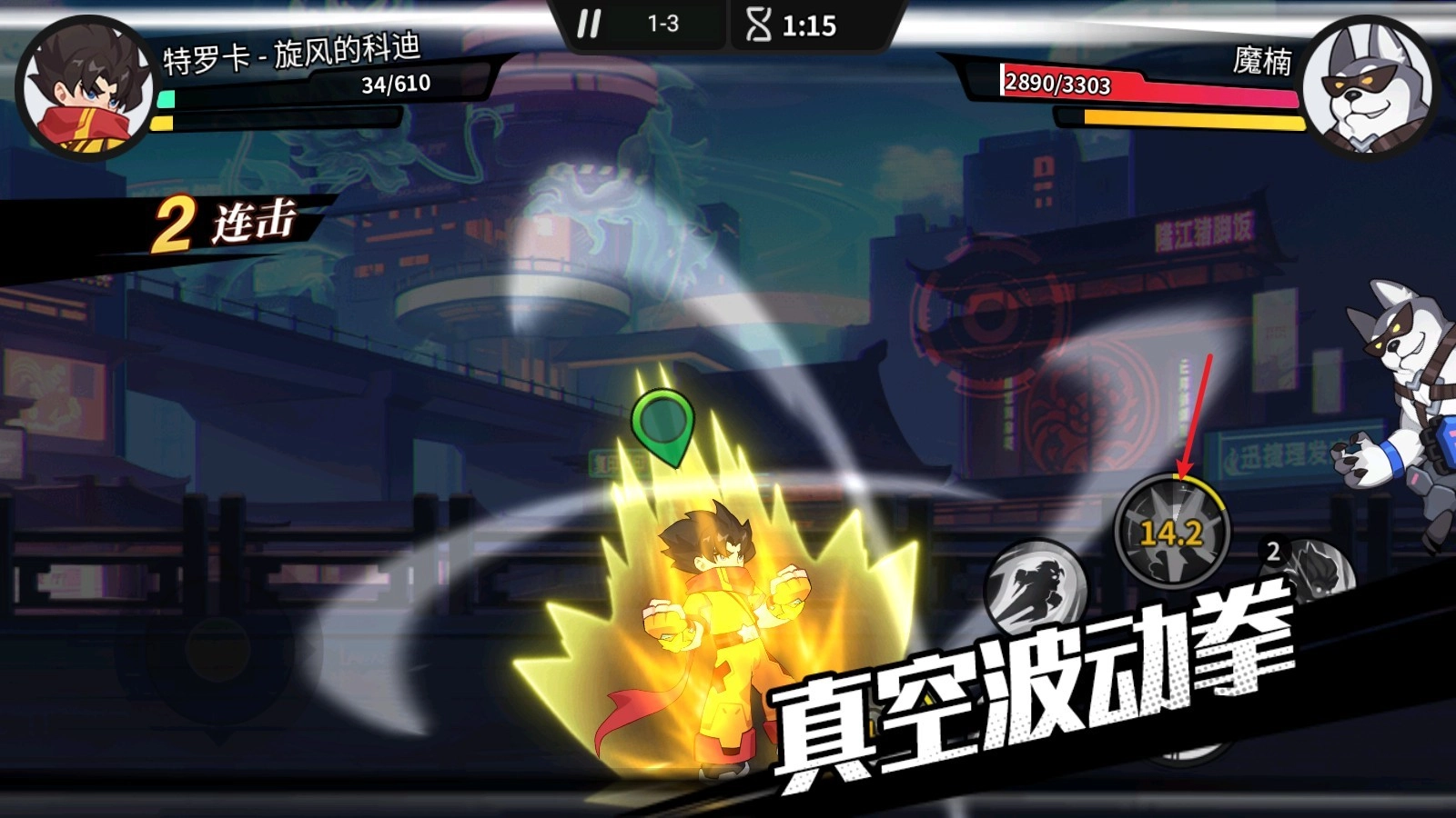 3、根据角色的不同特点,玩家可以选择不同的战斗方式,点击拳头进行普通攻击,使用左侧的两个按钮释放小技能。