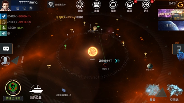 空间站传送:点击星系的任何空地,就会出现传送按钮(记住空间站不能传送至别人的联盟领地,这时是没有传送按钮的哦)。空间站传送消耗传送能量,传送能量满时能传送2次,传送cd15分钟。传送能量大概1-2天能恢复满,相当于传送基本免费,还有科研能提高回复速度。