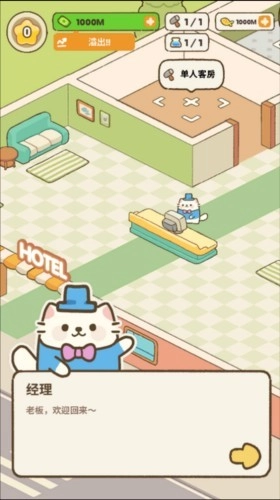 1、雇佣各种形象的猫咪员工,合理分配工作,提高酒店运营效率。