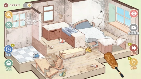 4、以第一关的“搬家日记”为范例,玩家需要将脏乱的新家打扫干净。