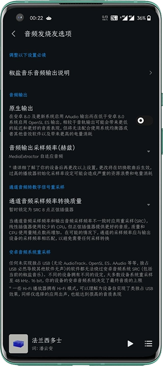 5、另外,在设置中有一项【音频发烧友选项】,光看名字便能知晓这是专为音乐发烧友打造的,其中涵盖了音频输出、采样频率等内容。