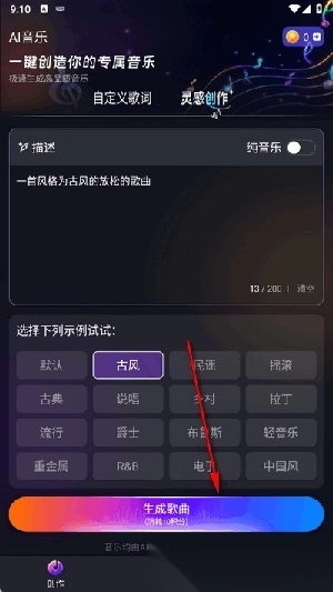 1. 可以自定义书写歌词,添加歌名,选择想要的音乐风格,就能生成歌曲了。