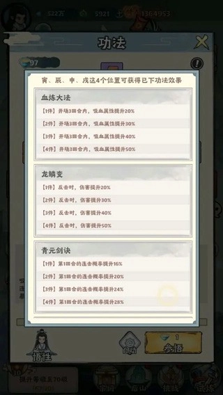 功法方面必选龙鳞变,不然反击流派没就意义了。4龙鳞直接伤害增加50%,这才是反击流的暴力之处。