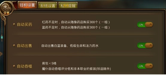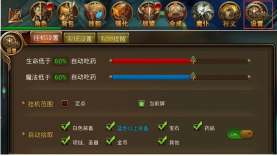 1、挂机前要设置好相应的挂机设置,挂机设置玩家可以在“设置”→“挂机设置”中进行。