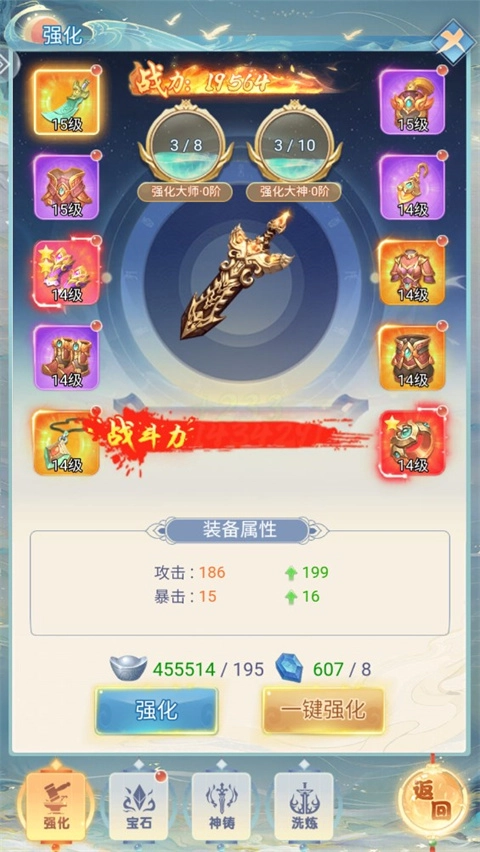 通过对武器进行强化、镶嵌宝石、神铸打造、属性洗练等操作,能够让你变得更加强大。