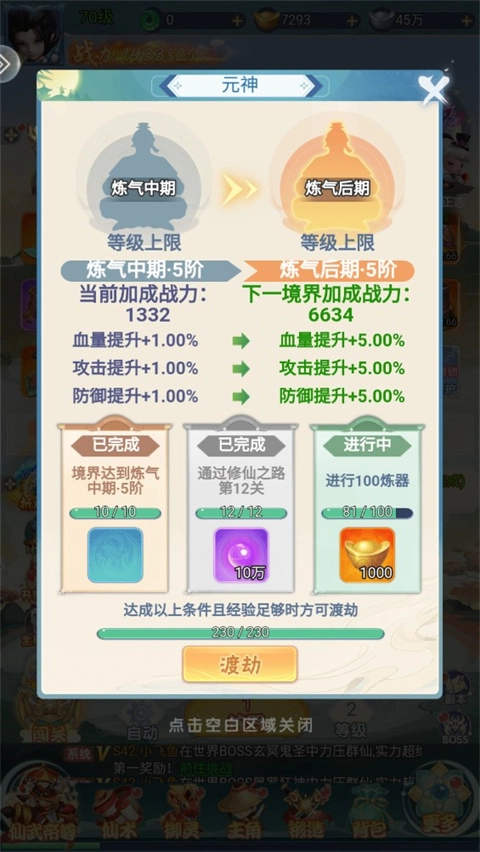 达成渡劫条件即可飞升下一境界,提升大量战力。