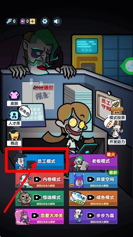 1.模式选择入口:点击主界面左侧的“员工模式”按钮即可进入基础挑战关卡,适合新手练习熟悉操作和机制。