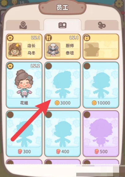 2、员工界面显示了所有员工的i资料,点击玩家尚未解锁的员工。