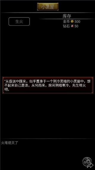 1、玩家将成为游戏中的主角,身处一个寒冷而昏暗的小黑屋中,首先需要点燃一堆火堆取暖。