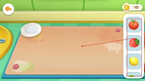 7、想让雪糕口感更佳,可以加入新鲜水果。左侧菜单提供三种水果,滑动屏幕就能将其切块,放入盘中备用。